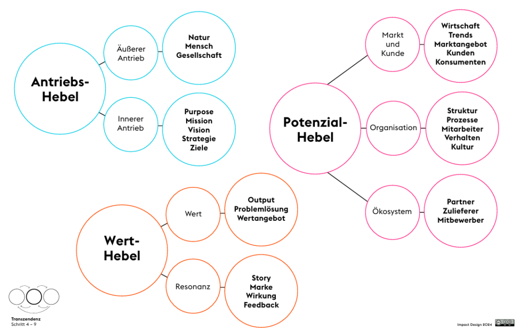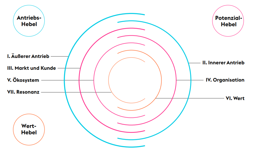 Äußerer Antrieb, Innerer Antrieb, Markt & Kunde, Organisation, Ökosystem, Wert, Resonanz.