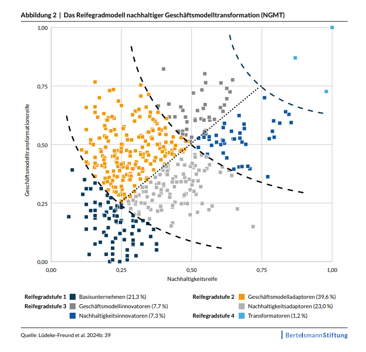 Die meisten Unternehmen liegen bei der nachhaltigen Weiterentwicklung von Geschäftsmodellen laut Studie noch im Mittelfeld. Es gibt Vorreiter, es gibt Nachzügler – die Mehrheit steckt „mittendrin“. Der durchschnittliche Reifegrad der nachhaltigen Geschäftsmodell-Transformation liegt jedoch erst bei 0,38 (Skala 0–1) – es gibt also substanzielle Reserven. Die gute Nachricht: Der Abstand zu den Besten ist machbar, wenn ihr fokussiert an den richtigen Stellhebeln arbeitet. Das entdramatisiert: Ihr müsst nicht alles neu erfinden, aber ihr solltet jetzt konsequent werden.