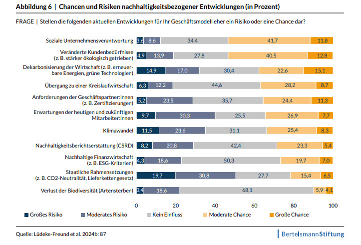 Die Studie zeigt: Ein großer Teil (rund 60%) der Unternehmen nennt das Thema Nachhaltigkeit als starken Treiber ihrer Geschäftsmodell-Entwicklung in den vergangenen Jahren. Wo ernsthaft am Geschäftsmodell gearbeitet wird, steigt in der Regel auch die Bedeutung von Klimaschutz, Kreislauf-Lösungen und sozialer Wirkung. Das ist keine Moral, das ist betriebliche Vernunft: Kund:innen, Mitarbeitende, Lieferketten, Kapitalmärkte und Politik fordern Richtung und Belege. Wer das ernst nimmt, gewinnt doppelt – heute im Wettbewerb, morgen in der Krisenfestigkeit.